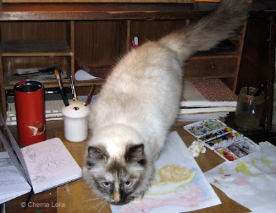 Patricia Delso, la joven e ilusionante editora de Marboré, que parecía una de las buenas hadas convocada a una fiesta de cuento en un palacio de cuento, anunció la presencia de Isamar Boirabruixa (¿se dice así? ¡es cómo una palabra mágica!). Desde detrás de una columna apareció entonces una mujer muy joven y risueña, con largas melenas y rastas en el pelo, toda vestida de negro. Pintado de blanco, desde su hombro parecía descender por su ropa un enorme gato blanco. Un gato fantasma, o una gata hada. Lo que fuera a pasar tendría que ver con animales, y más concretamente, con gatos. O con gatas.